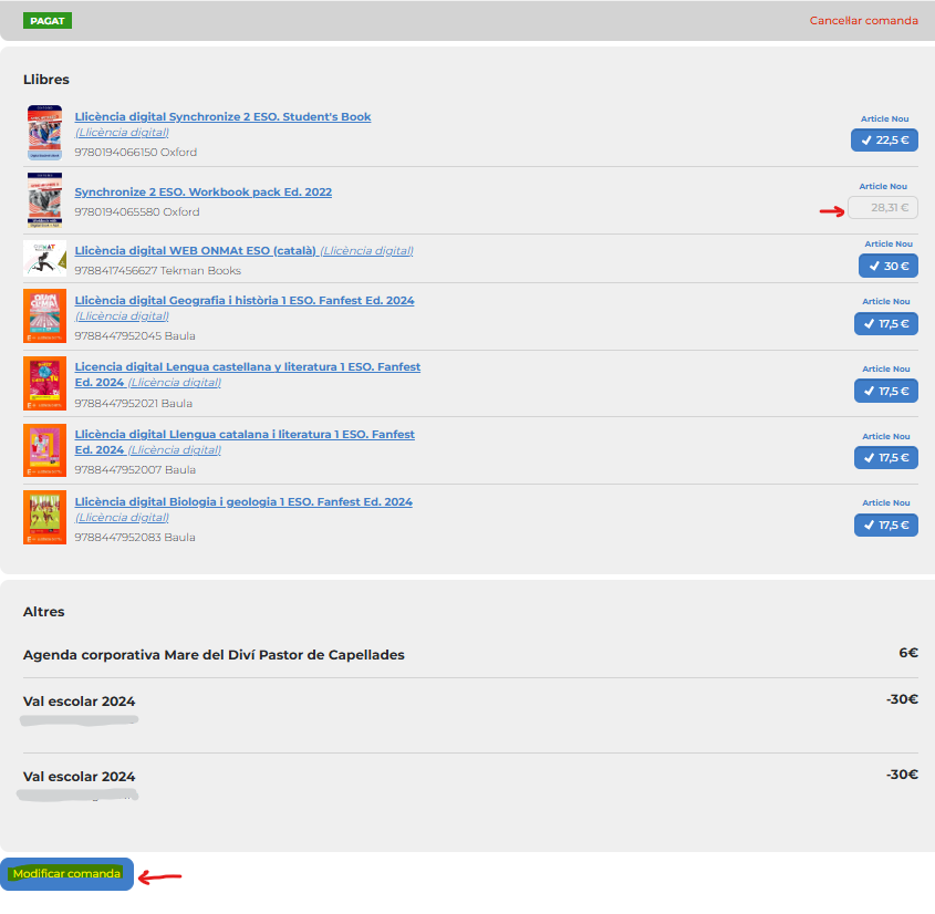 Si voleu eliminar un article, només cal que desmarqueu el preu i feu clic a “Modificar comanda”, que trobareu al final de la pàgina.