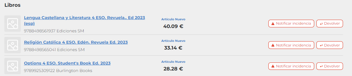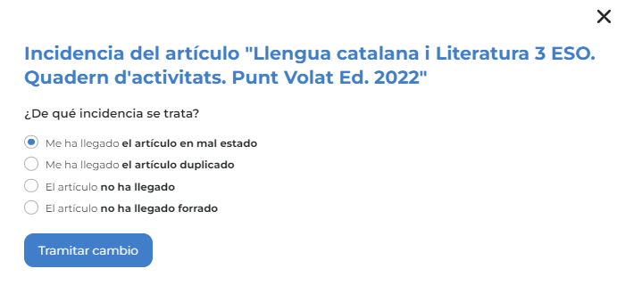En el caso de que hayan solicitado el forrado de libros, también tendrán la opción de notificar que un libro no ha llegado forrado. Este tipo de incidencia gestiona un nuevo envío de forros a medida del libro notificado.