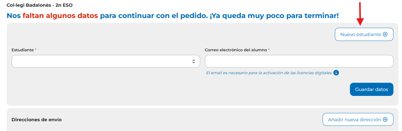 Una vez iniciamos el proceso de un pedido, tenemos la opción de escoger/añadir alumno.